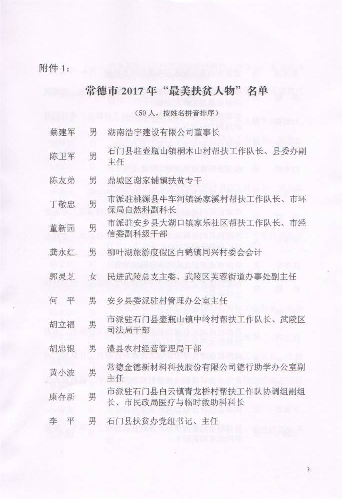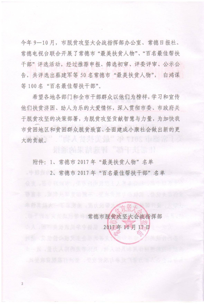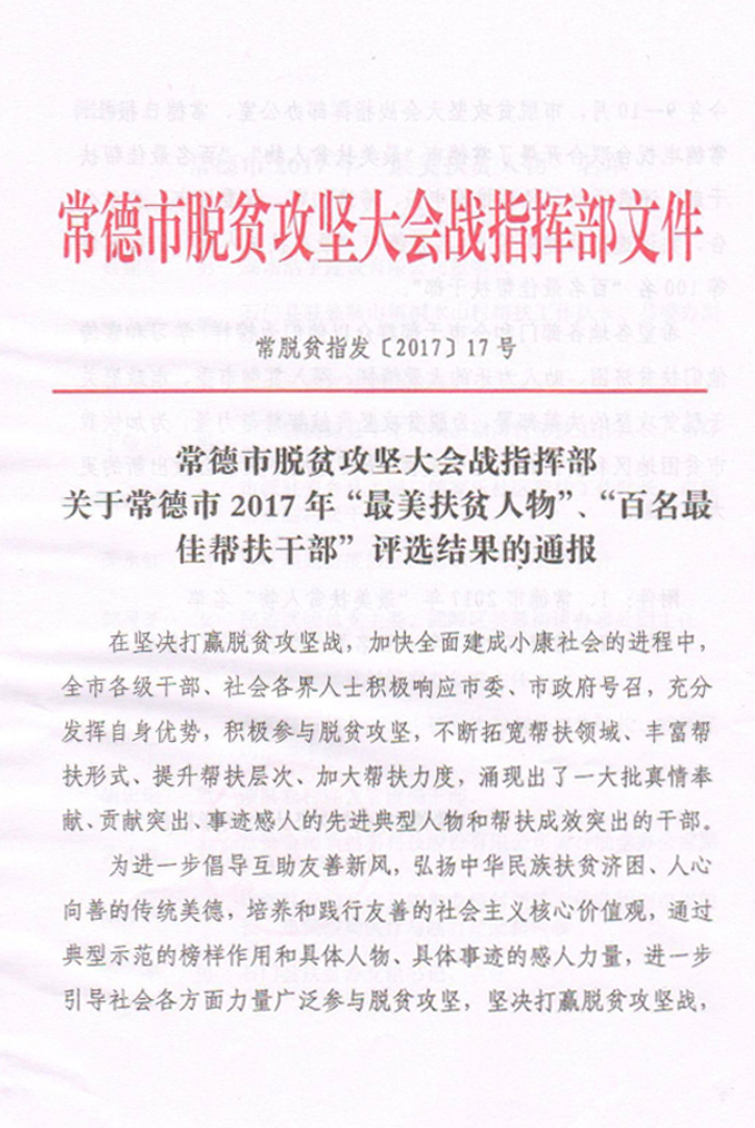 關于常德市2017年“最美扶貧人物”、“百名最佳幫扶干部”評選結果通報